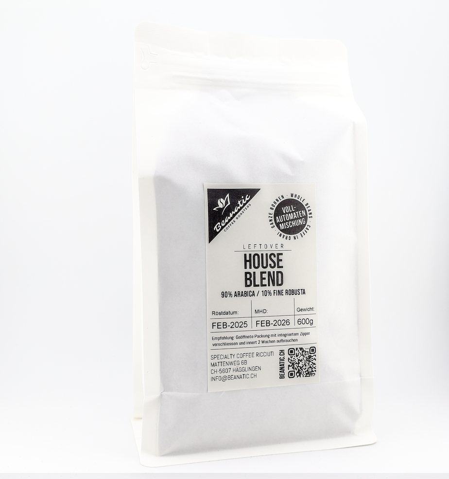 Unsere Vollautomaten-Mischung für den Alltag zu Hause oder als sanfter Begleiter im Büro. Die Mischung enthält diverse unserer Kaffees, welche wir separat geröstet haben. Da nach jeder Röstung eine gewisse Menge an Kaffee übrig bleibt und dieser für eine sortenreine Packung gewichtsmässig nicht ausreicht, verwenden wir diese „Kleinbestände“ in unserer „Leftover“-Linie. Als Mischung mit anderen passenden Kaffees sorgen wir mit diesem Kaffee immer für etwas Abwechslung in der Tasse. Wir finden es soll auch Kaffee geben, der nicht immer aus jeder Packung genau gleich schmecken muss, und für diese Idee konnten wir schon einige Fans gewinnen. Natürlich verwenden wir dafür ausschliesslich Spezialitätenkaffee aus unserem Sortiment. Der House Blend produziert im Vergleich zu unserem Business Blend einen milderen Kaffee, da wir in dieser Mischung die etwas milderen und helleren Röstungen kombinieren. Ideal für den Café Crème zu Hause und für Liebhaber von weniger „starken“ Kaffees.